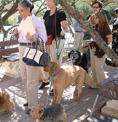 The liturgy began outside in front of the church. Dog owners, the choir and others staked out chairs and benches.Meanwhile, Georganna tagged me for the Random Facts meme. Pasting in the "rules" here: